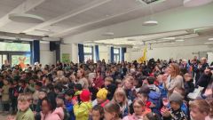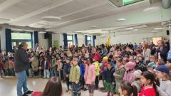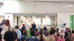 Alle Kinder und das Kollegium kamen nach der zweiten Pause in der Mensa zusammen. Frau Welsch und Siggi ließen es sich nicht nehmen, einige Abschiedsworte an die Anwesenden zu richten. Herr Eiberger hielt