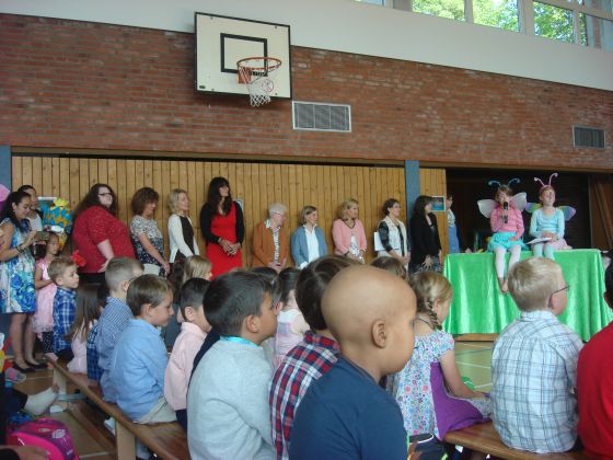 Lehrerinnen und Erzieherinnen lauschen mit dem Publikum den Sprecherinnen der Kl. 2a