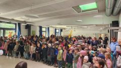 Alle Kinder und das Kollegium kamen nach der zweiten Pause in der Mensa zusammen. Frau Welsch und Siggi ließen es sich nicht nehmen, einige Abschiedsworte an die Anwesenden zu richten. Herr Eiberger hielt