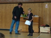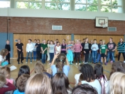 Die Schüler, Lehrer und einige Eltern trafen sich am letzten Schultag vor den Sommerferien in der Turnhalle. Einige Klassen führten etwas auf. Eltern wurden für ihr Engagement im Elterncafé, für das Jahrbuch, für die Bücherei oder für den Triathlon mit einem Blumenstrauß gedankt. Auf gleiche Weise wurden die Sekretärinnen, der Hausmeister und Frau Winkelhausen als Vertretung für den Kooperationspartner bedacht. Auch einige Schüler bekamen einen Blumenstrauß für ihre Arbeit als Streitschlichter oder für besondere sportliche Leistungen. Frau Sartiono wurde in den Mutterschutz verabschiedet. Die Viertklässler bekamen als Erinnerung an den Rungwisch das neue Jahrbuch überreicht. Schlussendlich gab es für Herrn Eiberger eine wunderschöne Schürze mit neon-pinker Krone und Tinkerbell - die wurde ihm von einer kreativen Mutter nach verlorener Wette überreicht. Tja Herr Eiberger, man muss doch immer aufpassen, mit wem man frotzelt... :) |