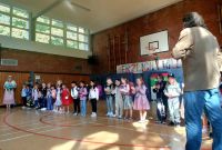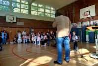 Sonnenblumenspalier in die Turnhalle geleitet. Herr Eiberger hielt eine kurze Ansprache. Dann führten die zweiten Klassen ein kleines Theaterstück auf und sangen ein Lied. Während der anschließenden ersten Schulstunde