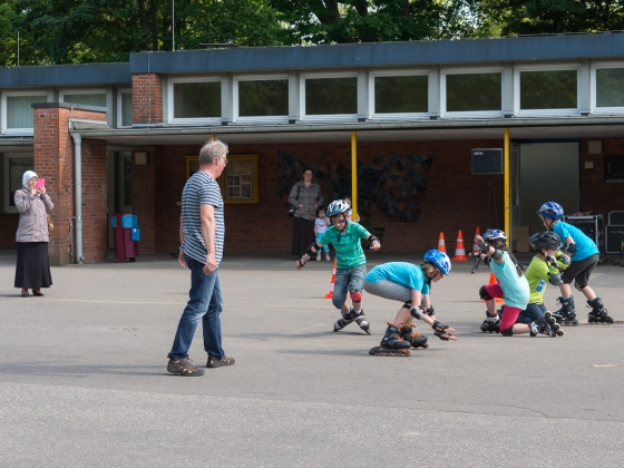 Die Inline-Fahrer zeigen die Falltechniken