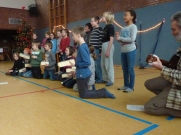 Wie immer am letzten Schultag vor den Weihnachtsferien trafen sich alle Klassen in der Turnhalle zu einer gemeinsamen Schulweihnachtsfeier. Es wurde viel gesungen. Außerdem gab es auch ein kleines englisches Theaterstück. Besonders intensiv bei der Sache waren alle bei dem gemeinsamen Abschlusslied "Feliz navidad". |
